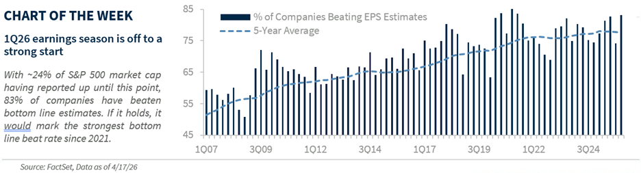 Beyond the de‑escalation in the US-Iran conflict, resilient corporate earnings have been a key catalyst behind the recent advance in equities. With ~24% of S&P 500 market capitalization having reported so far, fundamentals have reinforced investor confidence, as the 1Q26 earnings season has started on a strong note. Despite a higher bar coming into the quarter, ~83% of companies have beaten earnings-per-share (EPS) estimates by an average of 13%, the strongest beat rate and magnitude since 2021. Earnings season is set to accelerate next week, marking the busiest week of the 1Q26 reporting period, with ~44% of S&P 500 market capitalization scheduled to report. Given the recent strength in technology‑related sectors, we expect results from key tech leaders (Apple, Microsoft, Meta and Amazon) to confirm continued momentum in AI demand and investment, supporting our ongoing overweight to the technology sector. Meanwhile, reports from major consumer companies (Visa, Booking Holdings, Hilton and Yum! Brands) and Industrials (Caterpillar and FedEx) should offer valuable insight into the underlying resilience of the economy amid higher energy prices. While we believe corporate fundamentals remain solid, potential downward revisions to elevated forward estimates due to rising input costs could contribute to greater volatility in the weeks ahead.